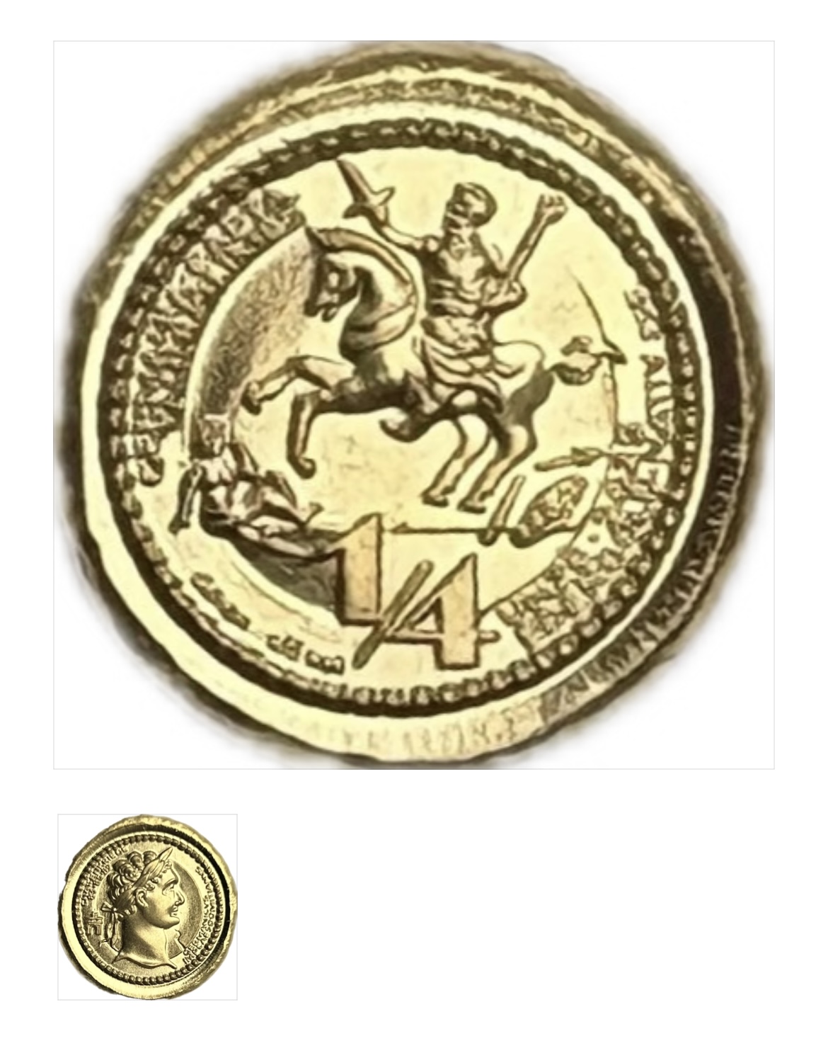 Av, Porträt der berühmte Titusbogen in Rom, gerissene Scheibe weist auf die Ermordung des Kaisers hin.
