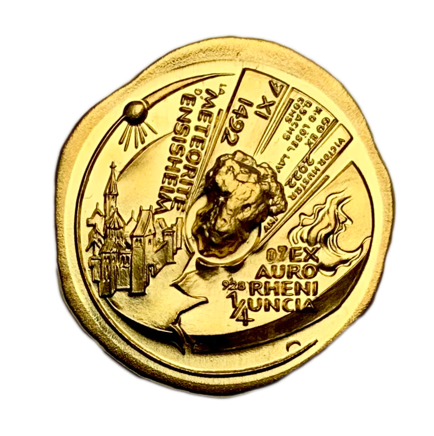 Aus im südlichen Elsass gewonnenem Rheingold geprägt behandeln diese Ausbeuteprägungen, zu 1/4 und 1 Unze, den Meteoriteneinschlag bei Ensisheim am 7. Oktober 1492, geschehen kurze Zeit nach der Entdeckung Amerikas durch Kolumbus am 12. Oktober 1492.
